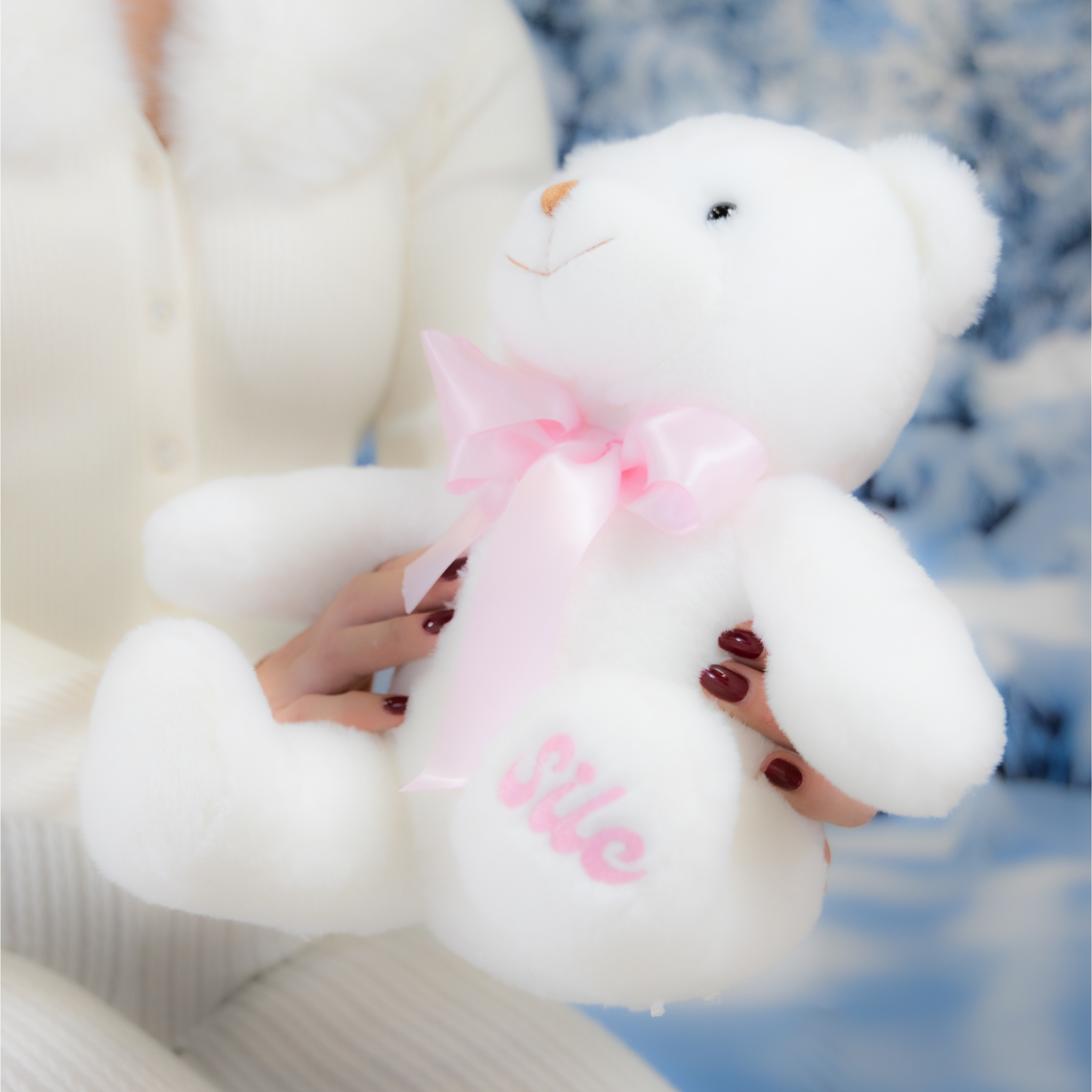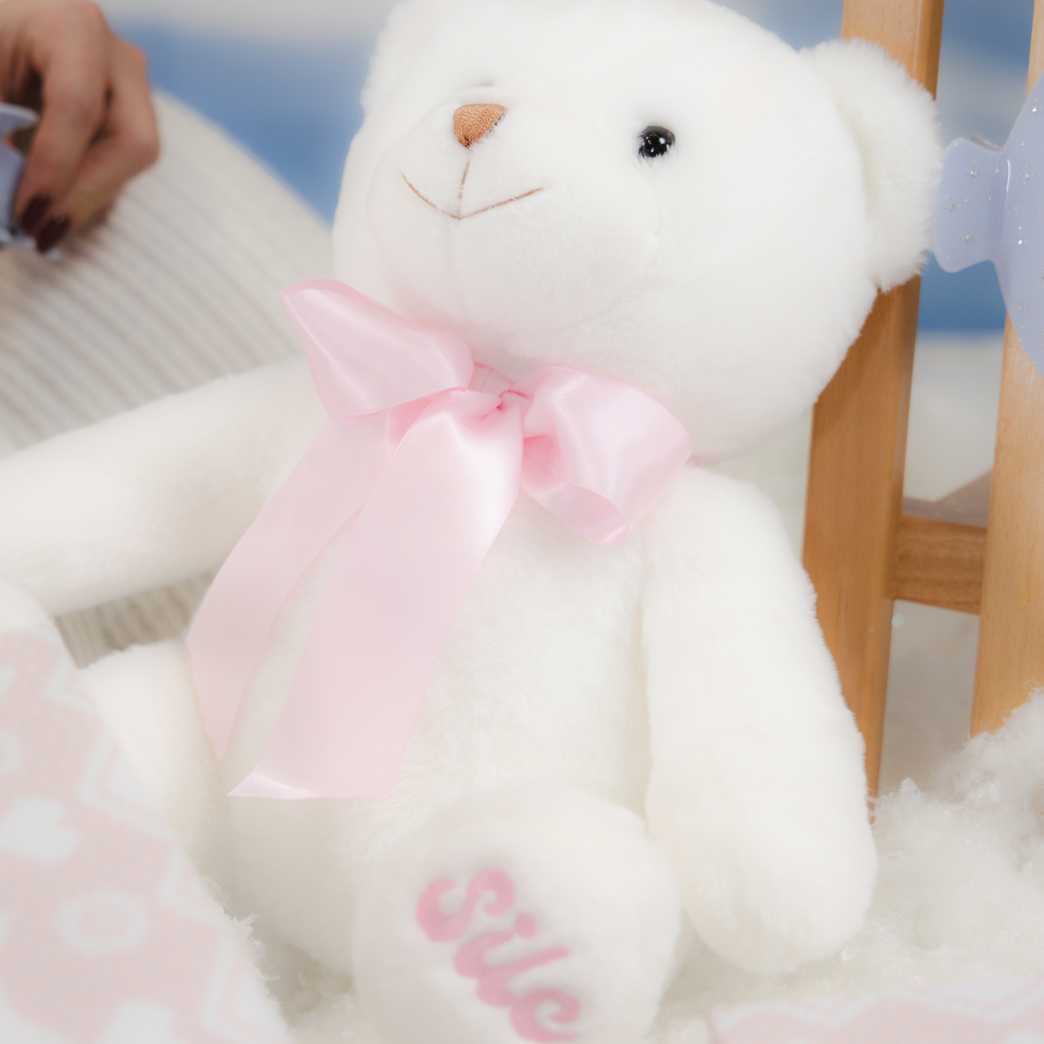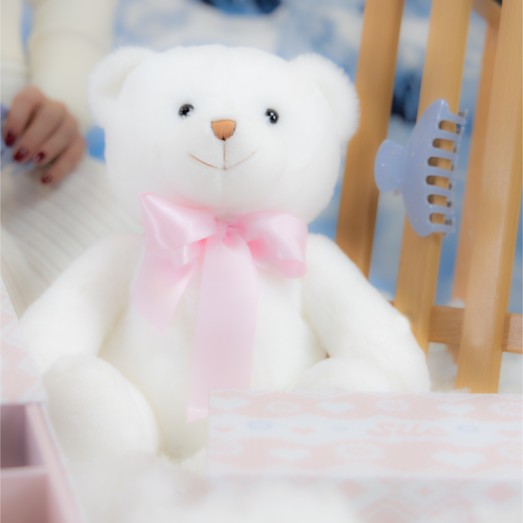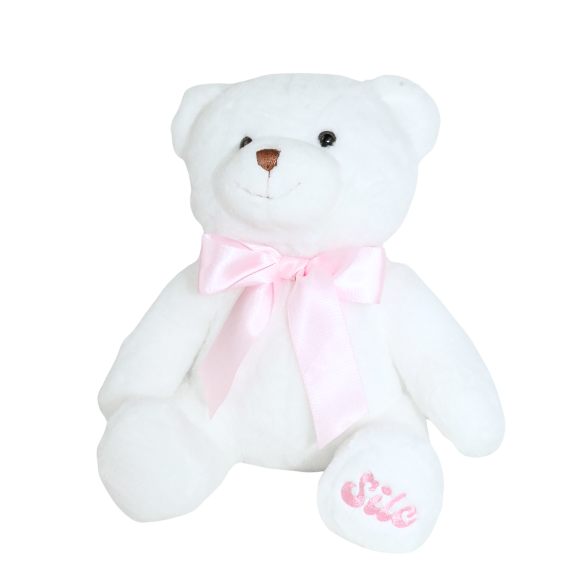 - Color: White Teddy Bear with baby pink ribbon